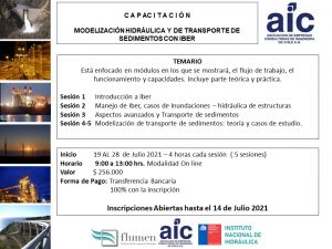 Dos profesionales del Instituto Nacional de Hidráulica participarán en el curso Modelización Hidráulica y de Transporte de Sedimentos con Iber, organizado por la Asociación de Empresas Consultoras de Ingeniería de Chile A.G. (AIC) y que se realizará entre el 19 y el 28 de julio próximo.